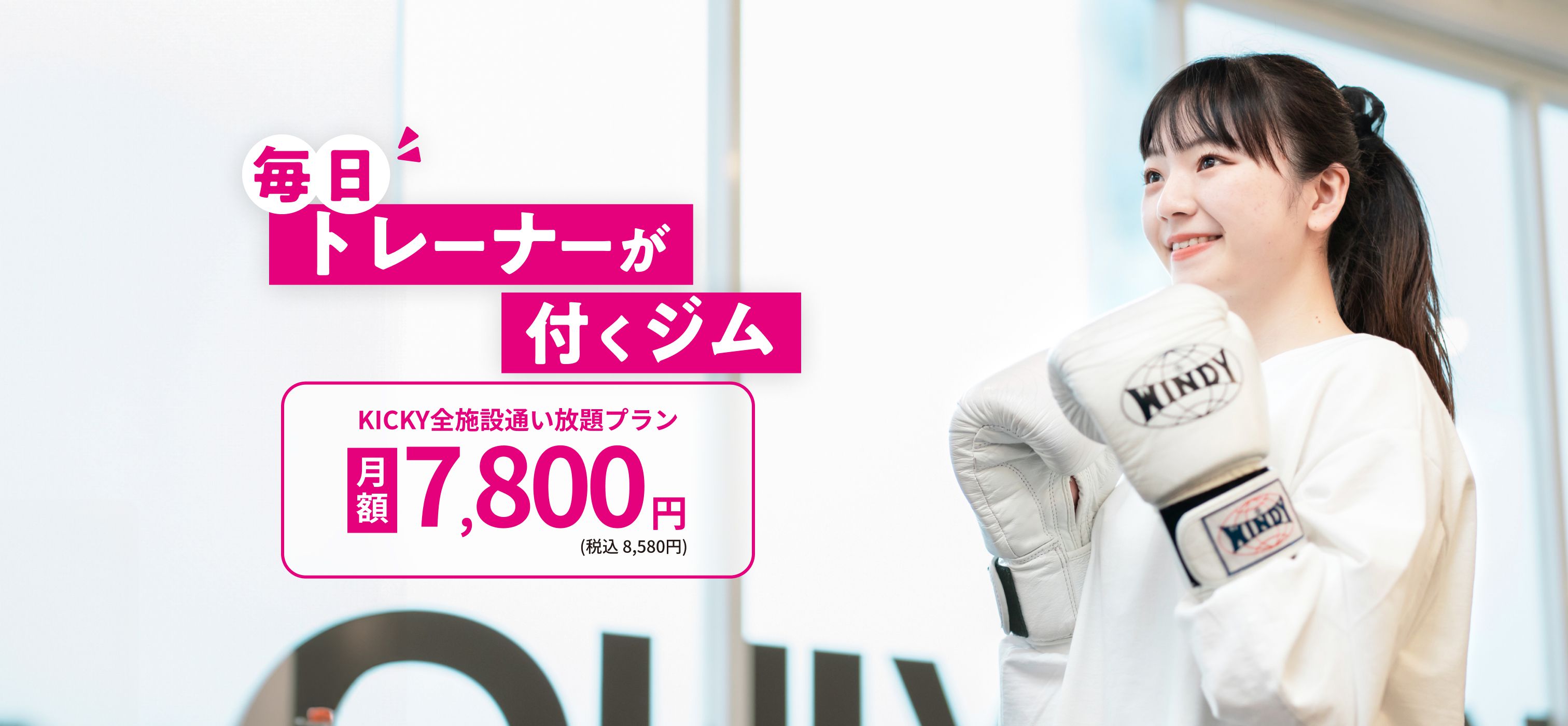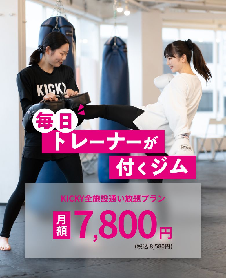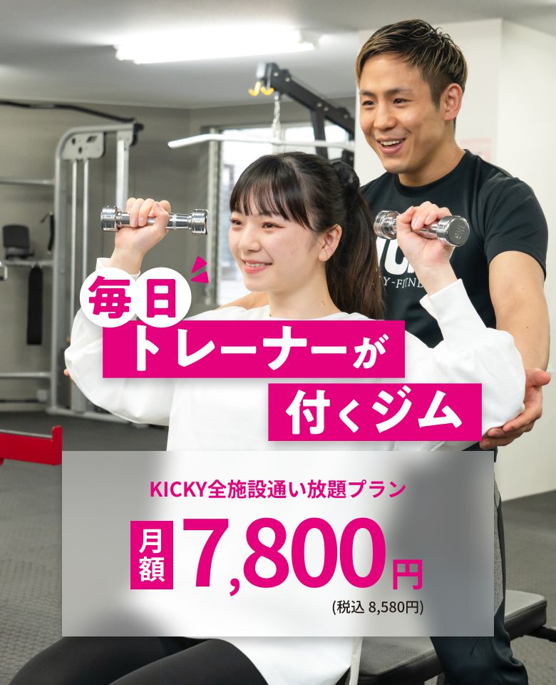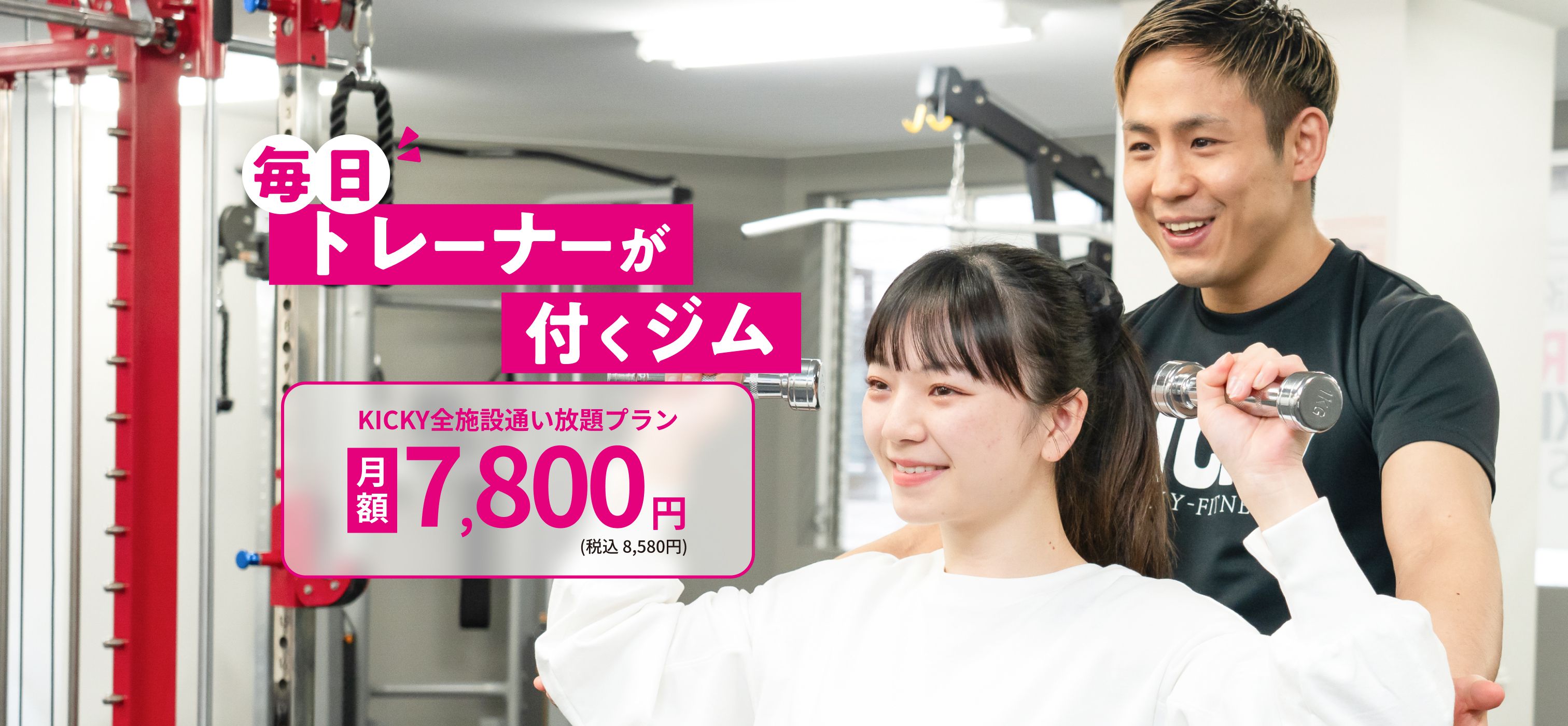 毎日トレーナーの指導を受けることができるジム KICKY全施設通い放題プラン 月額7,800円(税込 8,580円)
